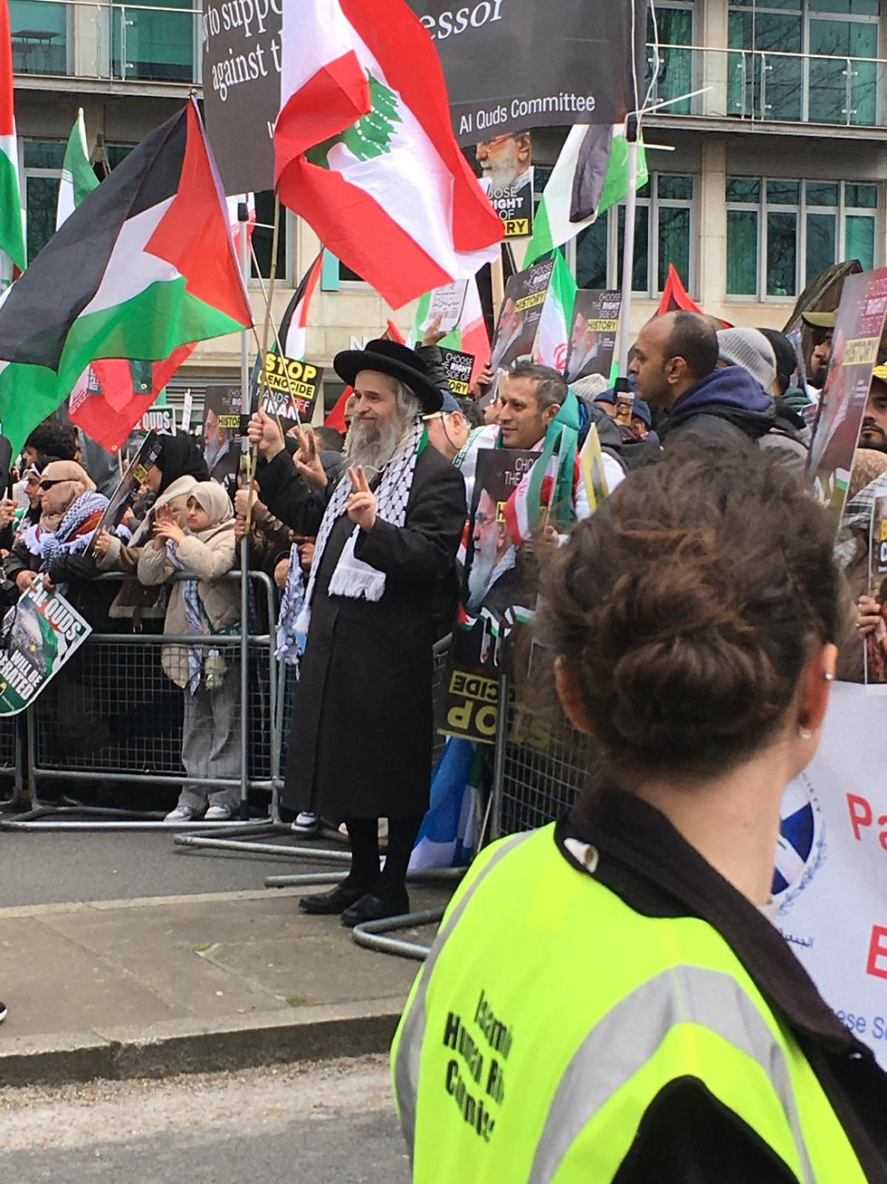The Al Quds events have been going on peacefully for 47 years though Israel lobbyists frequently try to get the authorities to stop them going ahead. This year they managed to get the event confined to a static protest on the Albert Embankment south of Lambeth Palace. There was a massive police presence.